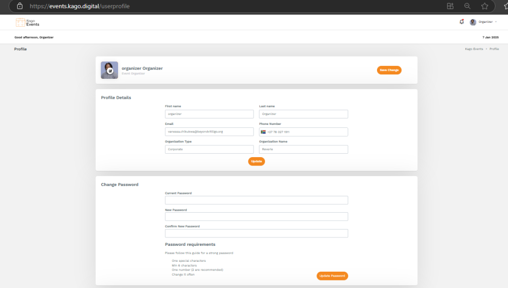 - Update Name, Password , Email, Phone (+country code), Organization Type, and Organization Name.