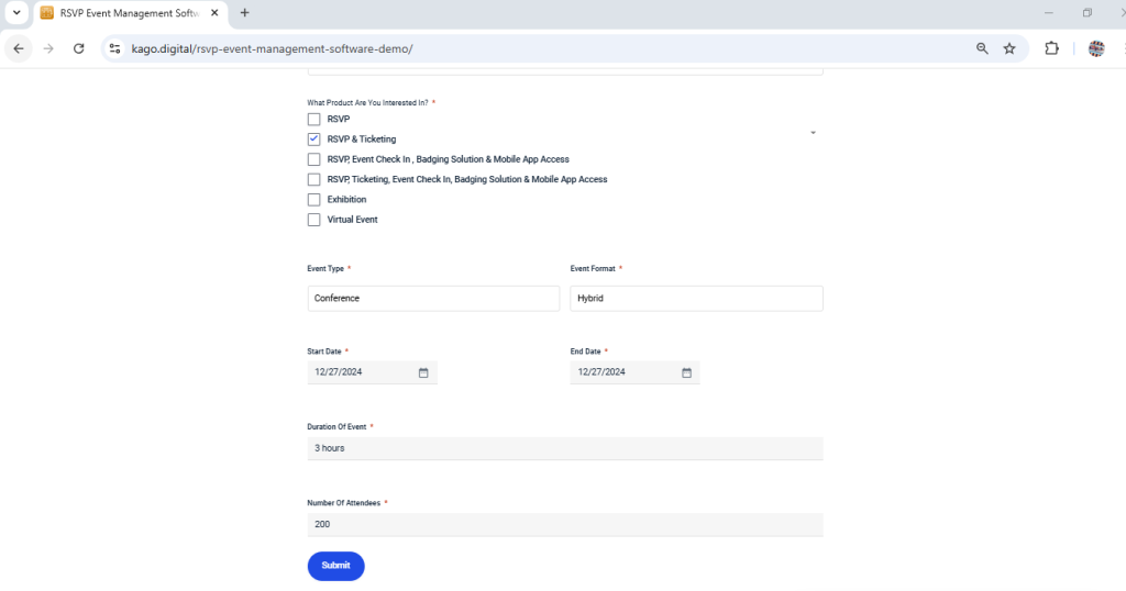 Fill out the Event Information Form by selecting your organization type, choosing the products you need, specifying event details (type, format, dates, duration, and attendees), and clicking Submit—ensure all required fields (*) are completed.