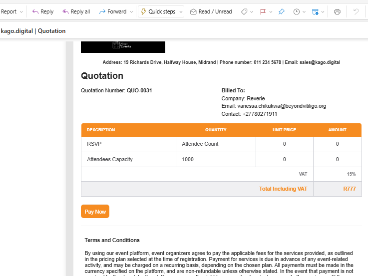 - Check your email for a message from Kago Events containing your quotation.