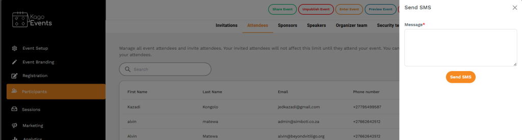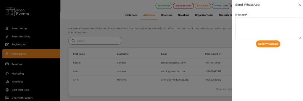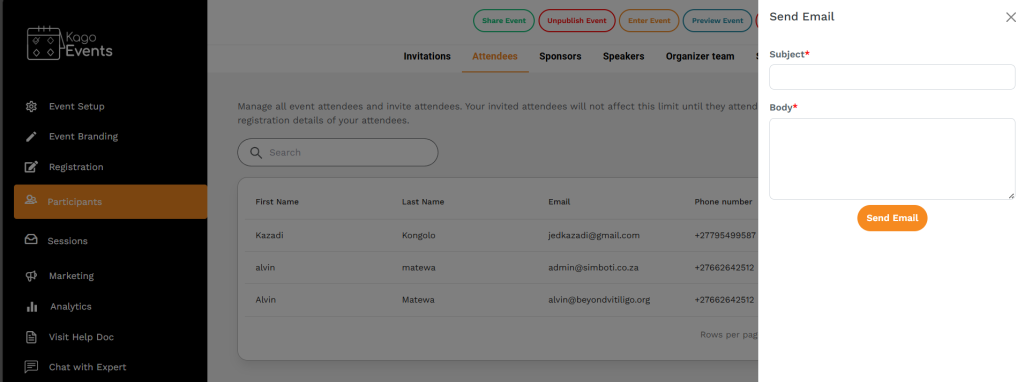 To communicate with your attendees using Kago Events, follow these steps:
