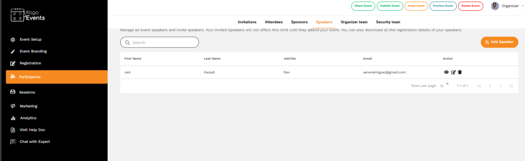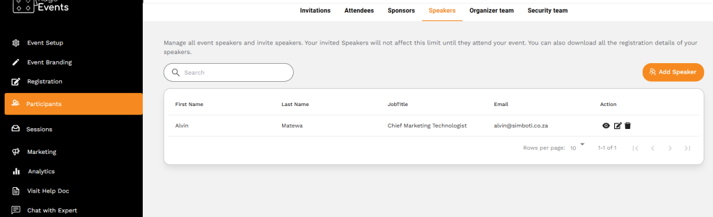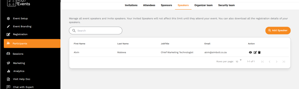 - To quickly view a speaker’s details without editing, click the View icon (eye icon) next to their entry.