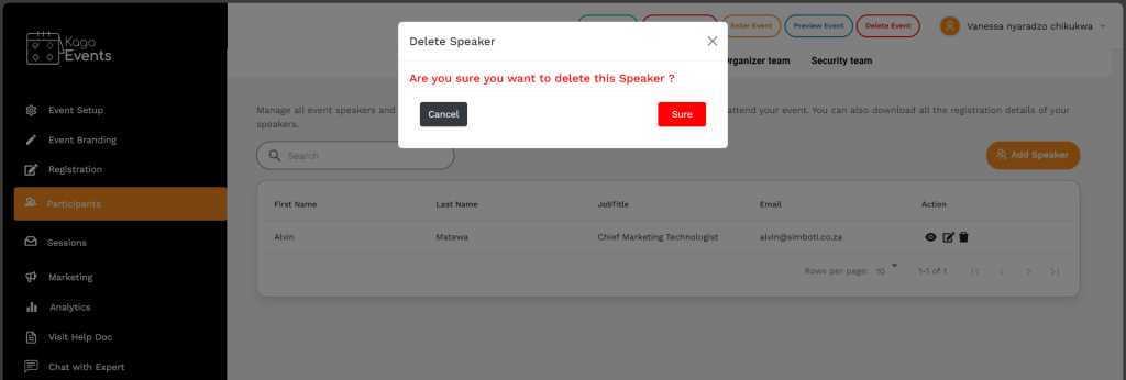 - To remove someone from the speaker list, click the Delete icon (trash can icon) next to their information. Confirm the deletion if prompted.