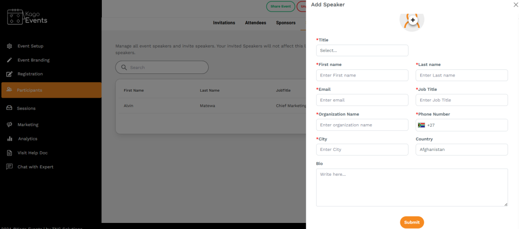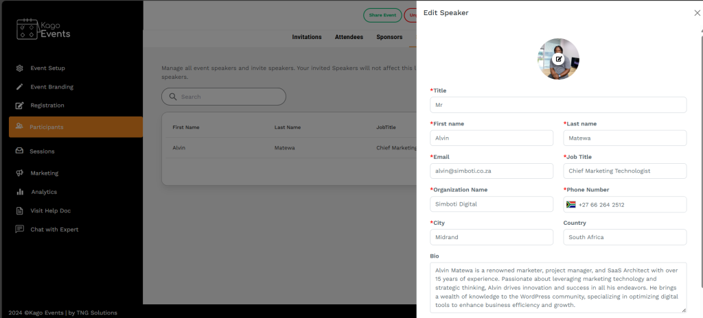 By following these steps, you can effectively add, update, and manage your team of speakers in Kago Events, ensuring each speaker has the correct information and is represented accurately on your event page.